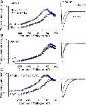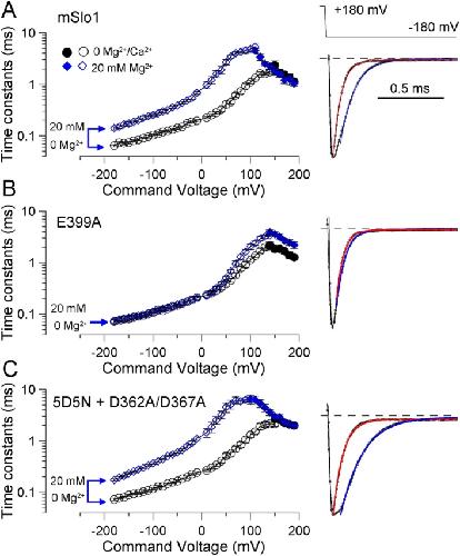 Figure 7. . The E399 low affinity site slows deactivation. Activation and deactivation time courses were determined as in Fig. 5 but either in the absence or presence of 20 mM Mg2+. (A) Effect of 20 mM Mg2+ on activation time constants or deactivation time constants in wild-type Slo1 (n = 6). Open symbols, deactivation; filled symbols, activation. Traces on the right show normalized deactivation currents at −180 mV with either 0 Mg2+ (red fitted line, 0.061 ms) or 20 mM Mg2+ (blue fitted line, 0.107 ms). (B) Effect of 20 mM Mg2+ on activation and deactivation time constants with the E399A mutation (n = 7). Traces on the right are as in A. τd: 0 μM Mg2+, 0.055 ms; 20 mM Mg2+, 0.066 ms. (C) Effect of 20 mM Mg2+ in the construct with both higher affinity sites mutated (5D5N+D362A/D367A; n = 7). Traces on the right are as in A. τd: 0 μM Mg2+, 0.076 ms; 20 mM Mg2+, 0.170 ms. Circles, 0 μM Mg2+; diamonds, 20 mM Mg2+. |