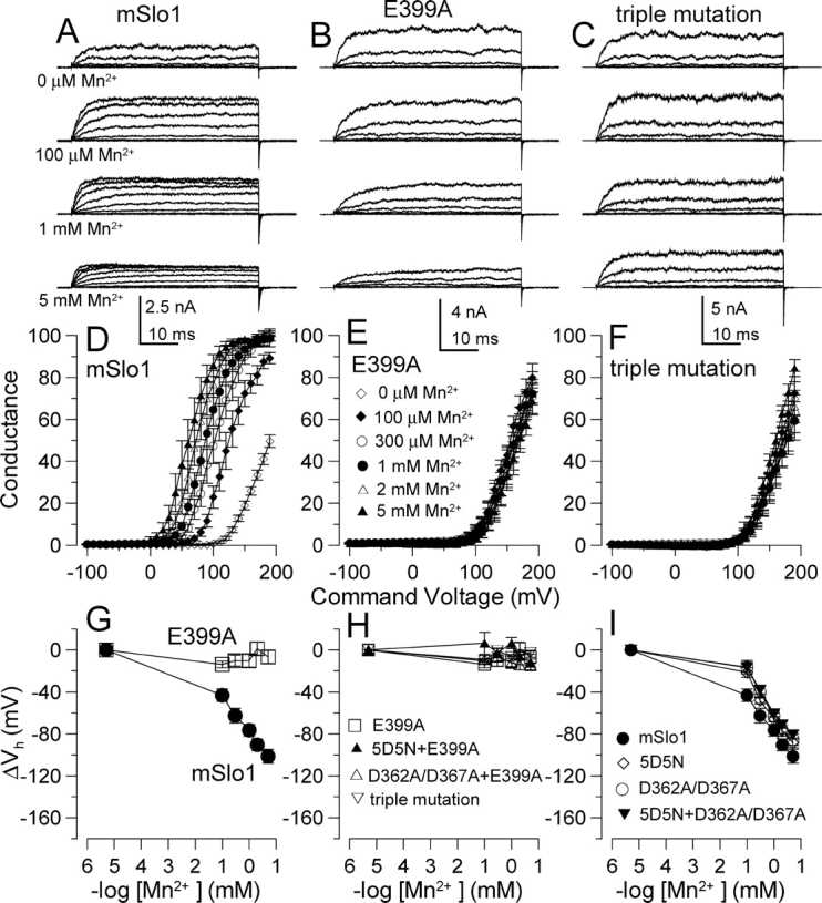 Figure 2. . The ability of Mn2+ to activate BK current depends on the E399 low affinity site. (A–C) Currents resulting from Slo1 (A), E399A (B), and the triple mutation (C, 5D5N + D362AD367A + E399A) were activated as in Fig. 1. (D–F) G–V curves were generated over [Mn2+]i from 0 to 5 mM for Slo1 (n = 6), E399A (n = 5), and the triple mutation (n = 5). Open diamonds, 0 μM; filled diamonds, 100 μM; open circles, 300 μM; filled circles, 1 mM; open triangles, 2 mM; filled triangles, 5 mM. (G) Activation ΔVh is plotted versus [Mn2+]i for Slo1 (n = 6) and E399A (n = 5). (H) Activation ΔVh is plotted versus [Mn2+]i for mutants containing E399A (5D5N + E399A, n = 4; D362A/D367A + E399A, n = 6; triple mutation, n = 5). (H) Activation ΔVh is plotted versus [Mn2+]i for Slo1 and mutants not containing E399A (5D5N, n = 5; D362A/D367A, n = 7; 5D5N + D362A/D367A, n = 8). |