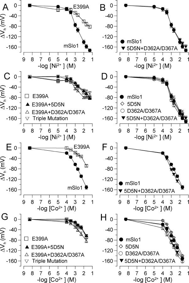 Figure 3. . Effects of Ni2+ and Co2+ are disrupted by the E399A mutation. (A) Activation ΔVh is plotted as a function of [Ni2+]i for Slo1 (n = 4) and E399A (n = 6). (B) Activation ΔVh is plotted as a function of [Ni2+] for Slo1 and the construct with mutation of both high affinity sites (5D5N + D362A/D367A, n = 5). (C) Activation ΔVh is plotted as a function of [Ni2+]i for all mutants containing E399A (5D5N + E399A, n = 6; D362A/D367A + E399A, n = 5; triple mutation, n = 6). (D) Activation ΔVh is plotted as a function of [Ni2+] for all constructs with an intact E399 (5D5N, n = 5; D362A/D367A, n = 9; 5D5N + D362A/D367A, n = 5). (E–H) Activation ΔVh is plotted as a function of [Co2+] for combinations of constructs identical to those in A–D. mSlo1, n = 5; 5D5N, n = 5; D362A/D367A, n = 4; E399A, n = 4; 5D5N + D362A/D367A, n = 5; 5D5N + E399A, n = 6; D362A/D367A + E399A, n = 5; triple mutation, n = 4. |