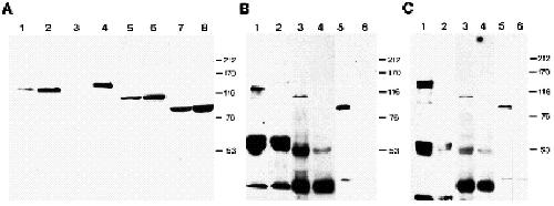 C (lanes 2, 4, and 6), mock precipitates using an inert IgG were used for electrophoresis. The strong signals in the lower part of B and C
