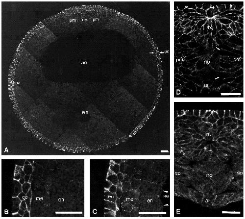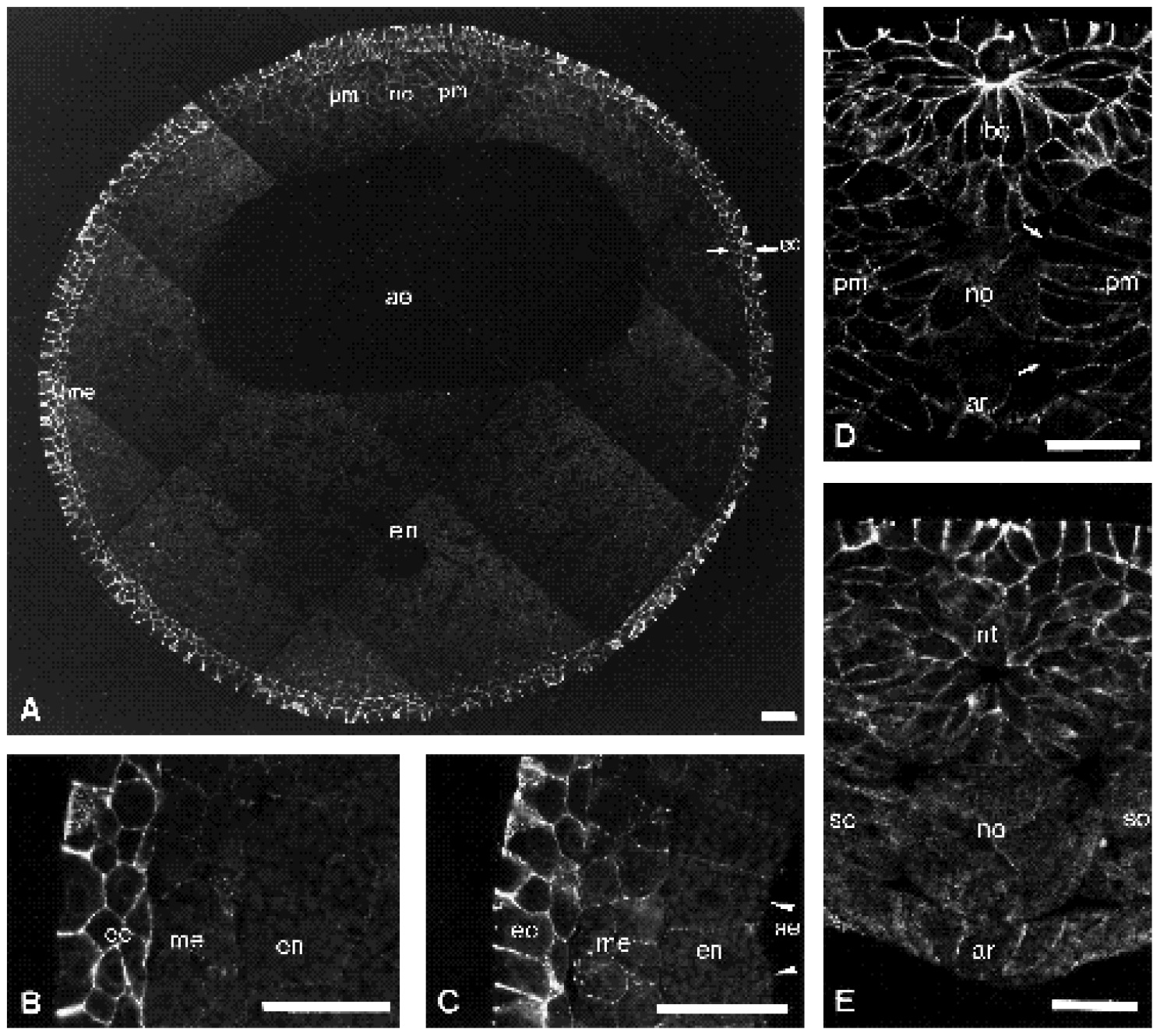 archenteron; ar, archenteron roof; bo, bottle cells; ec, ectoderm; en, endoderm; me, mesoderm; no, notochord; pm, paraxial mesoderm; so,