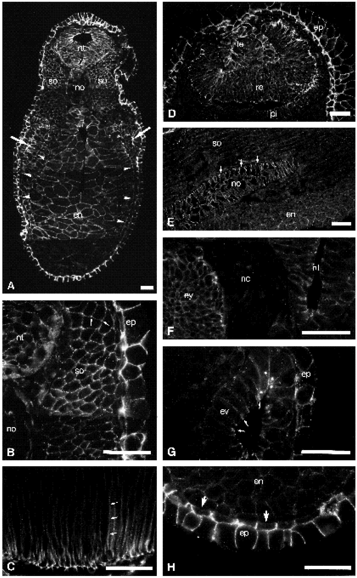Fig. 10. Distribution of a-catenin in the stage 27 tailbud embryo. (A) Transversal section showing staining patterns in different organ anlagen, particulary in the neural tube, pronephros anlage (arrows) and lateral plate mesoderm (arrowheads). (B, C, F, G and H) Details of transversal sections; (D,E) details of parasagittal sections. (B) Somite, arrows indicate the inhomogenuous staining pattern around the somite cells. (C) Cement gland, arrows point at a lateral plasma membrane of a columnar cell. (D) Eye vesicle. (E) Notochord, plasma membranes bordering the basal lamina are indicated by arrows. (F) Neural crest cells are unstained. (G) Ear vesicle, junctional concentrations of a- catenin are indicated by arrows. (H) Ventral epidermis, cell membranes of the bilayered epidermis adjacent to the basal lamina exhibit only weak staining (arrows). en, endoderm; ep, epidermis; ev, ear vesicle; ey, eye vesicle; le, lens placode; nc, neural crest cells; no, notochord; nt, neural tube; pi, pigment layer; re, retinal layer; so, somites. Same histological procedure as in Fig. 7. Bars: 50 um. |