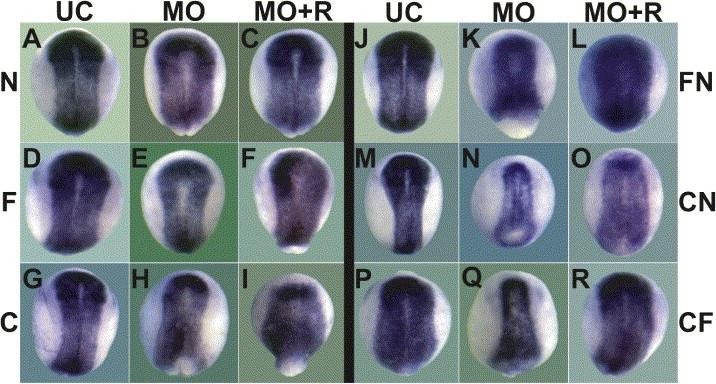 Figure 2. Single Morphants and Double Morphants Still Form a Substantial Neural PlateAll panels show sox2 expression to visualize the neural plate (dorsal views with anterior to the bottom) in neurula embryos (st 14â15). Uninjected embryos are shown (A, D, and G) with sibling noggin morphants (B), follistatin morphants (E), and chordin morphants (H). Double morphants include follistatin/noggin (K), chordin/noggin (N), and chordin/follistatin (Q) and are shown with sibling uninjected embryos (J, M, and P). Morphants were rescued with pufferfish noggin (C, F, I, L, O, and R). Abbreviations are as follows: F = follistatin, C = chordin, N = noggin, UC = uninjected sibling control embryos, MO = morphant, and MO + R = morphant rescued with noggin mRNA. |