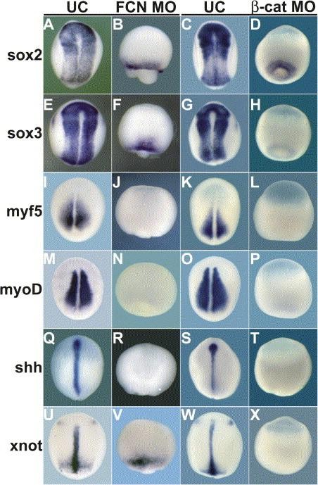 Figure 6. Spemannâs Organizer Is Specified in FCN MorphantsAll panels are vegetal views of early gastrula embryos (st 10.5 [AâT]) or midgastrula (st 11 [UâX]) with dorsal to the right in embryos where dorsal can be distinguished. Expression of multiple mesodermal markers (brachyury [xbra] [AâD], goosecoid [gsc] [EâH], xnr3 [IâL], siamois [MâP], vent2 [QâT], and myf5 [UâX]) are shown in uninjected sibling embryos (A, C, E, G, I, K, M, O, Q, S, U, and W) and FCN triple morphants (B, F, J, N, R, and V) as well as β-catenin morphants (D, H, L, P, T, and X) for comparison. |
