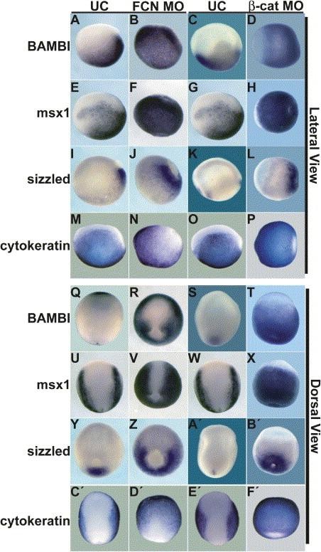 Figure 5. Ventral Tissues Are Expanded in FCN Morphants(AâP) are lateral views with anterior to the left of neurula (st 13â14) embryos, whereas (QâFâ²) are dorsal views with anterior to the top. Expression of multiple ventral markers (BAMBI [AâD and QâT], msx1 [EâH and UâX], sizzled [IâL and YâBâ²], and cytokeratin [MâP and Câ²âFâ²]) are shown in uninjected sibling embryos (A, C, E, G, I, K, M, O, Q, S, U, W, Y, Aâ², Câ², and Eâ²) and FCN triple morphants (B, F, J, N, R, V, Z, and Dâ²) as well as in β-catenin morphants (D, H, L, P, T, X, Bâ², and Fâ²) for comparison. |
