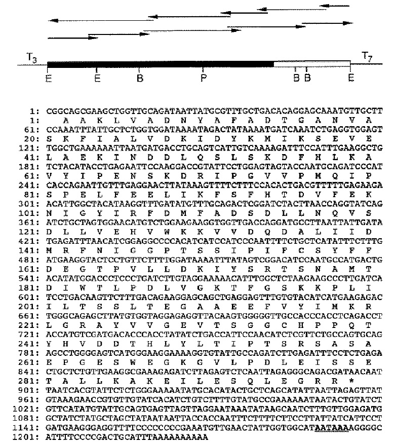cDNA. Top: map of the clone (Bluescript KS-). Arrows