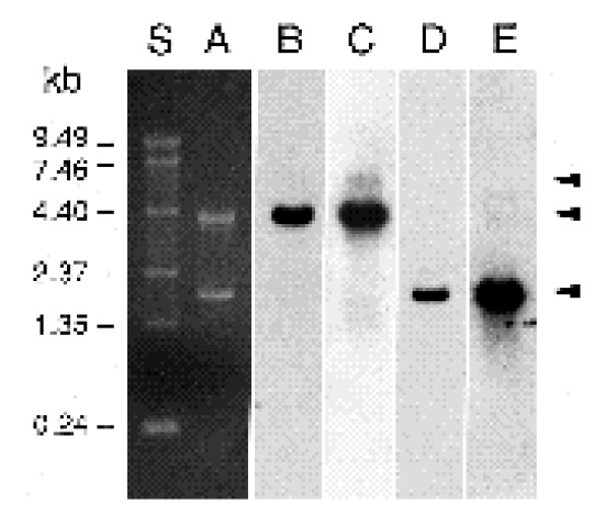 showing molecular mass standards (lane S) and total RNA (14 μg)