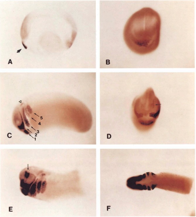 Fig. 3. (A) Wholemount in situ hybridization of XDLL-1 cRNA to stage 18 embryo visualizes expression of this gene in the cement gland (arrow), This is a lateral view of the embryo. (B) Anterior view of the same embryo. (C) Lateral view of stage 24 embryo demonstrates the expression of XDLL-1 in the neural crest derived visceral arches. 1, cement gland; 2, mandibular arch; 3, hyoid arch; 4, anterior branchial arch; 5, posterior branchial arch. Triangle points to the otic vesicle. (D) Anterior view of the same embryo as in (C), In this view the cement gland and the mandibular arch show strong hybridization. Arrow points to the hybridisation signal in the lateraldiencephalon. (E) In situ hybridization to stage 30 embryo (lateral view), At this stage in addition to the cement gland and visceral arches, the diencephalon (arrow) shows strong hybridization. (F) A dorsal view of the same embryo as in (E) shows the segment-like hybridization of XDLL-1 to the visceral arches in the head region. The posterior part of the embryo in (E) and (F) has been removed.