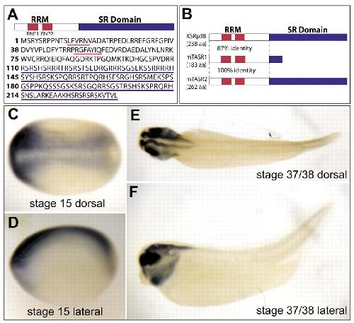 Fig. 1. Sequence and expression pattern of SRp38. (A) Schematic diagram of SRp38. SRp38 is a 238 amino acid protein with an N-terminal RNA recognition motif (RRM) containing two conserved ribonucleoprotein (RNP) domains and a C-terminal serine-arginine rich (SR) domain. RNPs are underlined in red and SR domain is underlined in blue. (B) The RRM of SRp38 is 87% identical to that of the mouse SRp38 isoforms (TASR1 and TASR2). The SR domain is low complexity and the homology drops considerably in this region. (C-F) Expression pattern of SRp38. (C,E) Dorsal view. (D,F) Lateral views. (C,D) At stage 15, SRp38 is expressed diffusely throughout the neural plate. (E,F) At later stages, SRp38 is expressed in the anterior of the embryo, throughout the neural tube, eyes and branchial arches, and surrounding the otic vesicle.