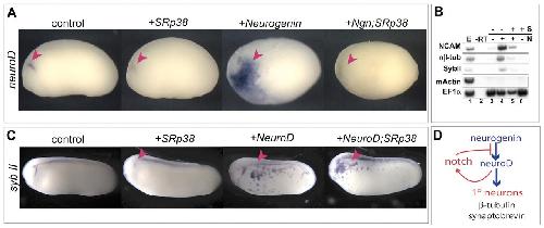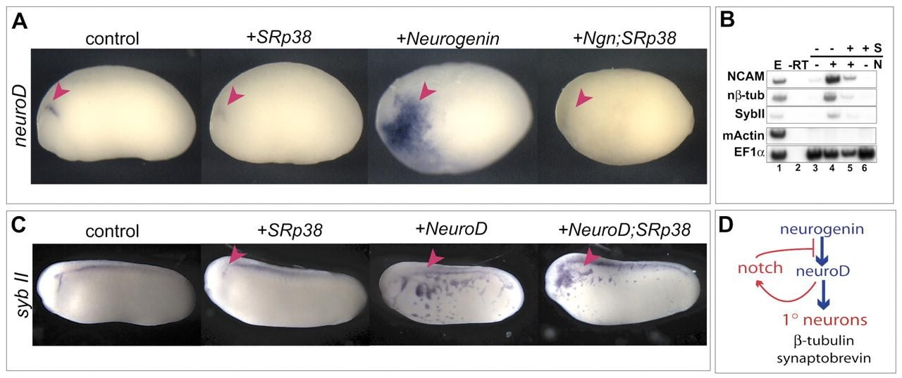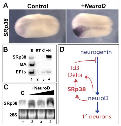 Fig. 7. SRp38 is induced by neuroD. (A) Dorsal views of SRp38 expression are pictured at stage 21. Left: control. Right: injection of 250 pg of neuroD into one cell at two cell-stage induces robust expression of SRp38. (B) RT-PCR on ectodermal explants. Injection of 250 pg of neuroD (+N) induces expression of SRp38. EF1α is a loading control and muscle actin (MA) controls for mesodermal contamination. (C) SRp38 northern blot on total RNA in embryos overexpressing increasing doses of neuroD (125 pg to 500 pg) results in increasing amounts of SRp38 RNA. (D) SRp38 is itself regulated by neuroD, suggesting it is a component of a neuroD-induced mechanism serving to limit neurogenesis.
