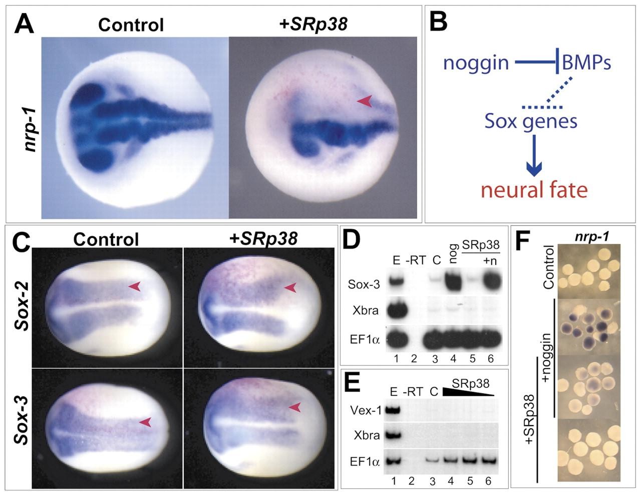 Fig. 2. SRp38 inhibits neural development but not initial induction of neural tissues. (A) In situ hybridization for neural specific nrp1, stage 21. Control embryo shows staining in the neural tube and eyes. Embryo injected in one cell at the two-cell stage with 500 pg SRp38 (right). Nrp-1 expression is lost at the site of injection (red arrowhead). (B) Simplified schematic of neural induction. Inhibition of bone morphogenetic protein (BMP) signaling by BMP antagonists, such as noggin, allows expression of Sox genes (Sox2 and Sox3) which then induce neural fates. (C) SRp38 does not block expression of Sox3 or Sox2 in whole embryos. Dorsal view of control embryos (left column) expressing Sox2 and Sox3 in the neural plate. Embryos injected in one cell at the two cell stage with 500 pg SRp38 (right column) also express Sox2 and Sox3 normally in the neural plate. Injected sides marked with red arrowhead. Lineage tracer in pink. (D) Ectodermal explant RT-PCR, stage 10.5. Noggin mRNA injection induces robust expression of Sox3 (lane 4). SRp38 co-expression is unable to block Sox3 expression (lane 6). (E) Ectodermal explant RT-PCR, stage 10.5. SRp38 mRNA injection does not induce expression of the BMP target Vex1. Embryos were injected with 500 pg (lane 4), 250 pg (lane 5) or 125 pg (lane 6). EF1α is a loading control and Xbra controls for mesodermal contamination. (F) In situ hybridization for nrp1 (neural). Noggin injected animal caps express nrp1 and co-injection of SRp38 prevents nrp1 expression.