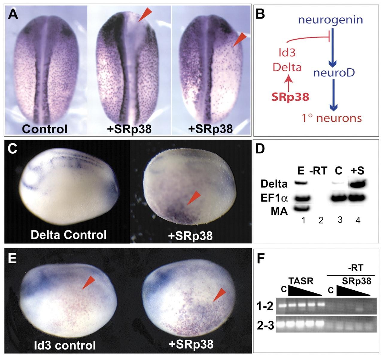 Fig. 5. SRp38 inhibits neurogenesis and induces Delta/Id3. (A) In situ hybridization for non-specific β-tubulin stains the ciliated epidermis and neurons. Left, control embryo. Middle, injection of 500 pg SRp38 targeted to the neural plate results in a loss of neuronalβ -tubulin. Right, overexpression of 500 pg SRp38 in the epidermis leads to a decrease in ciliated epidermal cells. Both of these phenotypes are symptomatic of Notch activation. Injection sites marked by red arrowhead. (B) Schematic model of SRp38 inhibition of neurogenesis. SRp38 inhibition of neurogenin activity may act via Delta and Id3. (C) Lateral views of stage 18 embryos stained for Delta. Left: control embryo. Right: injection of 500 pg of SRp38 induces robust expression of Delta (red arrowhead). (D) RT-PCR analysis of animal caps expressing 500 pg SRp38 (lane 4). (Uninjected control: C, lane 3.) SRp38 induces ectopic expression of Delta, lane 4. EF1α is a loading control and muscle actin (MA) controls for mesodermal contamination. (E) Lateral views of stage 18 embryos stained for Id3. Left: control embryo. Right: injection of 500 pg of SRp38 induces expression of Id3 (red arrowhead). (F) RT-PCR analysis of Id3 splicing. Primers were designed to span exons 1-2 or exons 2-3. Embryos treated with decreasing doses of SRp38 (500 pg to 100 pg) were analyzed for changes in the amount of spliced products. No discernible changes were found.