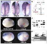 Fig. 3. SRp38 can inhibit mesodermal differentiation. Control embryos on left. SRp38 injection (250 pg each) on right. Some embryos are also stained for lacZ activity (in red) as a lineage tracer. All injection sites are marked with black arrowhead. (A-C) Early mesoderm injections were targeted toward ventral domains. In situ hybridization for Bix1, stage 9.5 (A); brachyury, stage 11 (B); and wnt8, stage 11 (C). SRp38 injection (250 pg each, right) does not inhibit expression of Bix1 but does inhibit expression of Brachyury and wnt8. (D) In situ hybridization for myoD, stage 25. Dorsal injection of SRp38 (250 pg each, right) inhibits expression of myoD at the site of injection (marked by red tracer). (E) In situ hybridization for α-globin, stage 25. Ventral injection of SRp38 (250 pg each, right) inhibits expression of α-globin at the site of injection. (F) Tor70 antibody reveals disrupted notochord development in embryos injected dorsally with SRp38 (two sections on right, notochord indicated by red arrowhead).