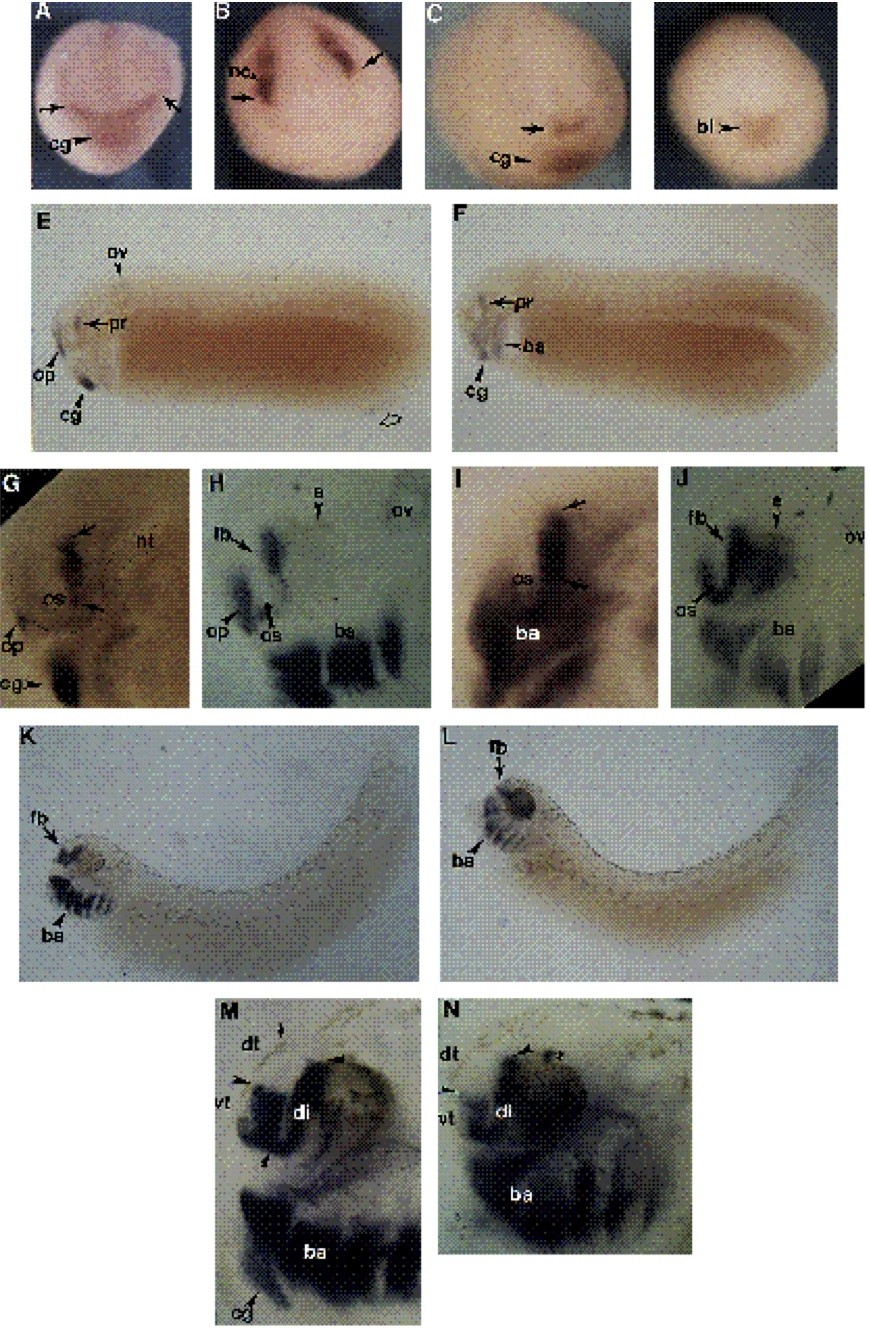 Fig. 4. Developmental expression of X-dll4, 3 and 2 by whole- mount in situ hybridization. In all panels apart from these on the top row, anterior is to the leftand dorsal to the top. A, C, E, G, H, K and M show the ontogenesis of X-dll3 while F, I, J, L and N show the ontogenesis of X-dll4. (A) Frontal view of X-dll3 expression at the open neural plate stage (stage 16). Staining is observed in the cement gland and the anterior transverse rim of the neural plate. (B) Frontal view of X-twi expression in the premigratory cranial neural crest at the same stage (stage 16). InA and B, arrows indicate the lateral limits of expression. Note that X-twi and X-dll3 expression is not overlapping and if superimposed would label most of the anterior and anterolateral rim of the neural plate. (C) Frontal view of a non-cleared embryo showing the external expression of X-dll3 a few stages later, after neural tube closure. Expression externally is detected in a band of cells, probably representing the olfactory placode (arrow) and the cement gland (cg). (D) Rear view of the same embryo as inC, showing expression of X-dll3 around the closed blastopore lip, the prospective proctodeum (arrowhead). (E,F) Side views of cleared tailbud stage (stage 25) Xenopus, showing expression of X-dll3 (E) and X-dll4 (F). (G,I) Higher magnification of E and F. X-dll3 is expressed in the prosencephalon, olfactory placode, otic vesicle and cement gland (E,G) and X-dll4 is expressed in what appears to be the same region of the prosencephalon and, in addition, in the branchial arches and cement gland (F,I). The A-P limits of expression in the prosencephalon are delimited by arrows. The contour of the brain has been traced by a dashed line inG but is also visible in I. (H) Expression of X-dll3 in the brain of a cleared stage 33 embryo. (J) expression of X-dll4 at the same stage. Note that, in addition to the sites of expression at stage 25, X-dll3 is now also expressed in the branchial arches (H) and X-dll4 is also expressed in the eye (J). (K,L) Whole cleared tadpoles showing that X-dll3 (K) and X-dll4 (L) are expressed in the forebrain and all of the branchial arches. (M,N) Higher magnifications of X-dll3 and X-dll4 expression respectivelyat the same stage as in K and L. In M, small arrows point to the telencephalic-diencephalic boundary. In M and N, arrowheads point to the dorsal limit of expression in the telencephalon and diencephalon. Note that expression in the tadpole brain appears more extensive relative to expression at the tailbud stage (compare M and N with G and I; see text for details). The asterisk inN indicates a staining artifact. Abbreviations: ba, branchial arches; bl, blastopore; cg, cement gland; di, dienecephalon; dt, dorsal telencephalon; e, eye; fb, forebrain; op, olfactory placode; os, optic stalk; ov, otic vesicle; vt, ventral telencephalon. |