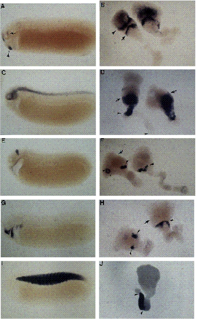 Fig. 7. Induction of gene expression by planar signals. Expression in tailbud stage embryos is shown on the left column (anterior to the left) and expression in age-matched Keller sandwiches is shown on the right column (anterior to the top). (A,B) X-dll3; (C,D) N- CAM; (E,F) En-2; (G,H) X-twi; (I,J) Actin. In A and B, arrows point to expression in the forebrain and arrowheads to expression in the cement gland. A higher magnification of A (Fig. 4G) shows that the level of X-dll3 expression in the prosencephalon is comparable to the level in cement gland and olfactory placode. Note that expression of X-dll3 in a Keller sandwich occurs around the edge of the non-elongated part of the neural ectoderm. In D and J, the limits of the mesoderm are denoted by arrowheads, illustrating that in a Keller sandwich the mesoderm forms away from the neural ectoderm. In D, the anterior limit of N-CAM hybridization is marked by an arrow and roughly the same level has been marked by arrows in B, F and H. In H, note that the X-twi hybridization is localized close to the base of the non-elongated part of the neural ectoderm (arrowheads), at about the same A-P level with en-2 (arrowheads in F). Both markers are clearly more posterior than X-dll3 (compare B with F and H). The staining denoted by an asterisk in F is an artifact. |