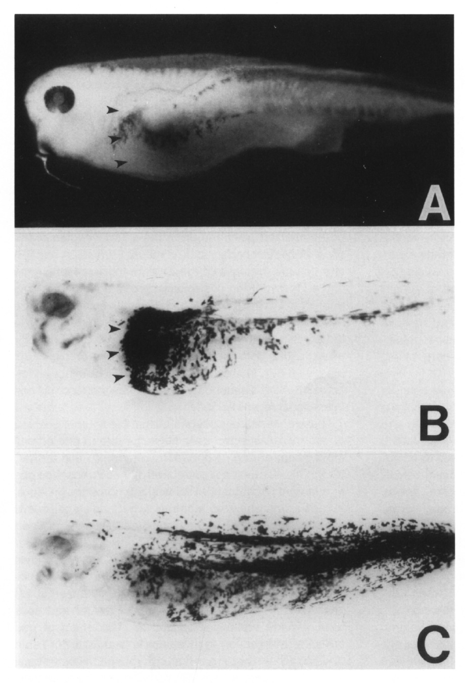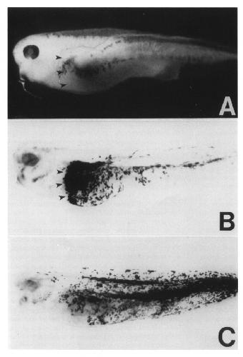 Figure 2. Cells Ectopically Expressing gsc Migrate to the Anterior of the Secondary Axis (A) Embryo (stage 36) with secondary axis resulting from a single C4 injection of 0.2 ng of gsc mRNA. (6) Same embryo as in (A), after visualization of coinjected CG lineage tracer. Note that labeled cells contribute mostly to the anterior of the secondary axis (arrowheads), while the posterior of the secondary axis is mostly unlabeled, as is the posterior of the main axis. (C) Control embryo injected with CG alone, showing labeling of lateral plate mesoderm, muscle, and epidermis as typically found in C4 lineage-traced blastomeres (Dale and Slack, 1987; Moody, 1987). Embryos injected with dgsc mRNA into C4 blastomeres did not develop secondary axes or ectopic muscle, but sometimes showed less lateral plate labeling for unknown reasons. A total of four experiments were carried out (n = 23). |