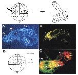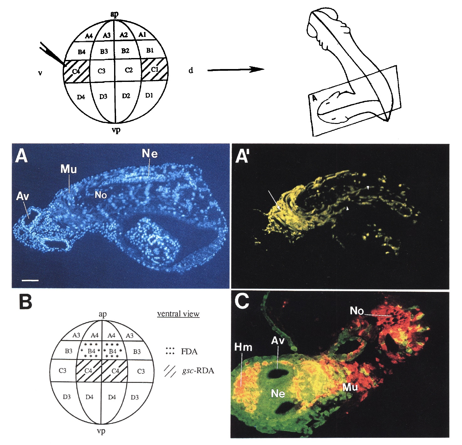 Figure 1, Cells Ectopically Expressing gsc Are Pluripotent and Recruit Neighboring Cells (Top left) Schematic diagram of a 32-cell embryo highlighting blastomeres used for injections. (Top right) Twinned tadpole resulting from microinjection into ventral blastomeres and the plane of section used in (A) are indicated. (A) Nuclear staining (Hoechst 33258) of a secondary embryo (stage 34) resulting from coinjection of 0.2 ng of synthetic gsc mRNA and 20 mg/ml FDA into two C4 blastomeres; only the gsc-induced secondary axis is shown in these oblique sections. (Aâ) FDA labeling of the progeny of the injected blastomeres in the same embryo shown in (A). Neural tissue is largely unlabeled (e.g., auditory vesicles), as is muscle in posterior areas (arrowheads in [Aâj). Labeled cells are found in all mesodermal tissues. Five embryos were serially sectioned and analyzed in this way. Note that labeled cells are more concentrated in the anterior region of the secondary axis (arrow in [Aâj). (B) Experimental design of a double labeling lineage tracing experiment in which the two C4 blastomeres were injected with rhodamine-dextran and gsc mRNA and the two overlying 84 cells with FDA alone. (C) Result of the experiment outlined in (B). The resulting secondary axis is labeled, with gsc-injected cells (red) contributing to notochord, muscle, and head mesoderm, while the overlying cells are recruited (green) to form auditory vesicles, neural tissue, and muscle in the secondary axis. Sections were 10 urn thick, explaining the yellow borders due to overlap of both types of cells. Six secondary axes were serially sectioned in this way; only two had notochords, but all of them had green and red muscle cells in the secondary axes. ap, animal pole: Av. auditory vesicle; d, dorsal; En, endoderm; Mu, muscle; Hm, head mesoderm; Ne, neural tissue; No, notochord; v, ventral; vp, vegetal pole. Bar is 50 pm. |