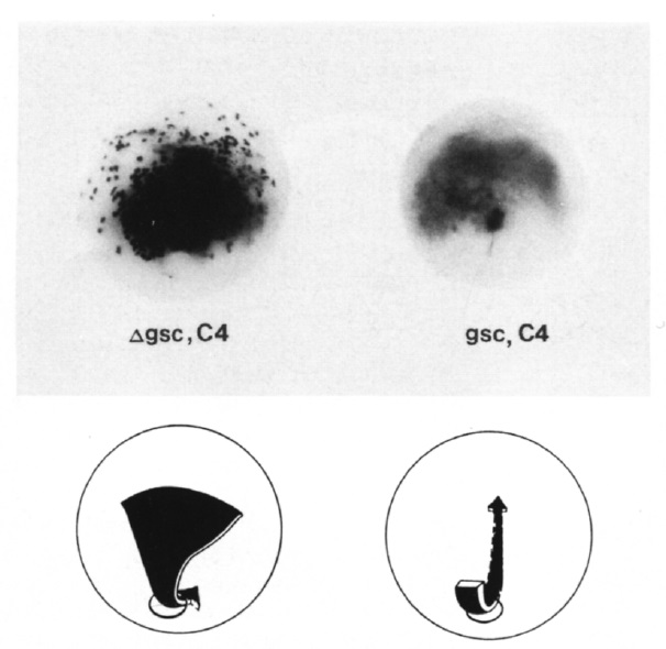 Figure 3. gsc mRNA Injection Enhances Involution in Ventral Blastomeres CG and either dgsc (left) or gsc mRNA (right) (0.2 ng) were coinjected into one C4 blastomere of 32-tell embryos and fixed at the early neurula stage (stage 14). Embryos are shown in ventral view with the blastopore at the bottom. The embryos were not cleared, but were analyzed instead in 70% ethanol where they remained opaque and predominantly showed the noninvoluted external tissue layer. Note that in the gsc-injected embryo, the labeled mesoderm has involuted almost completely, with only a few cells near the blastopore remaining on the surface. |
