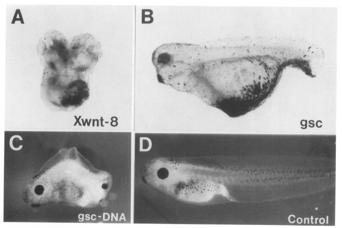 Figure 5. gsc Acts in the Organizer Proper (A and B) CG and either Xwnf-8 (A) or gsc mRNA (B) were coinjected into a D4 blastomere of 32cell embryos. Tadpoles (stage 34) are shown from the front (A) or the side (B). Note in (A) that Xwnf-8 has induced a twinned head, while labeled injected cells remain in the deep endoderm (n = 16). Note in (B) that gsc-injected cells form part of the secondary axis, where they concentrate in the anterior (n = 17). (C) Embryo injected with 50 pg of pCMVgsc plasmid DNA into each of two ventral vegetal blastomeres at the E-cell stage. (0) An uninjected embryo at the same stage. Note that the total length of the embryo in (C) is much shortened. Microinjection of DNA into 8- to 16-tell stage embryos produced secondary axes with an average frequency of 28% (two experiments, n = 107). Only one tadpole developed complete anterior structures (eye and cement gland; shown in [Cl). |