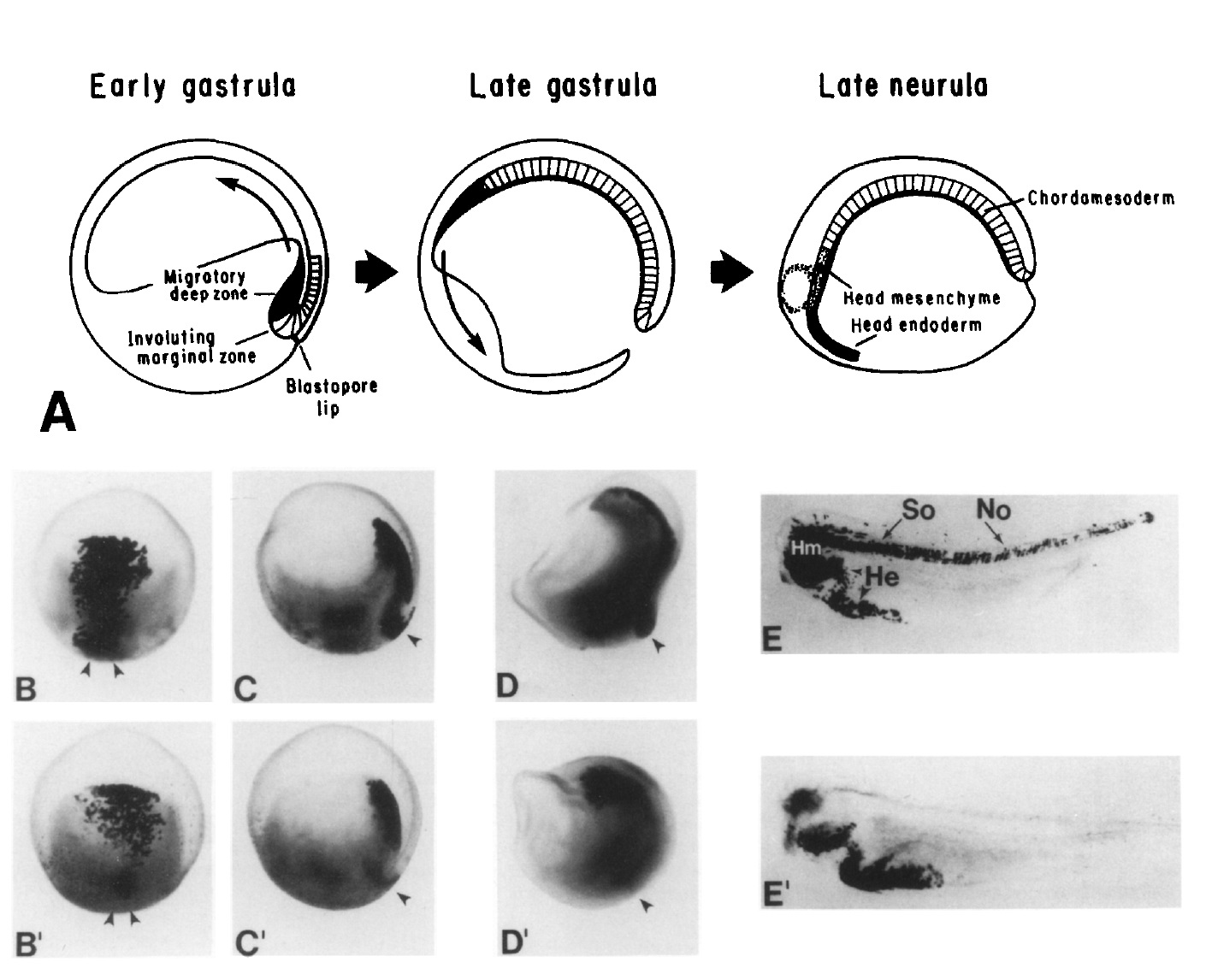 Figure 6. gsc mRNA Injection in Prospective Organizer Cells Changes the Motile Behavior of Involuting Cells Leading to Changes in Cell Fate (A) Schematic depiction of dorsal mesoderm movements in Xenopus gastrulation. At the early gastrula stage, the dorsal mesoderm consists of two distinct regions: the migratory deep zone cells (indicated by the filled areas) that crawl along the blastocoel roof and the involuting marginal zone cells (hatched sections) that undergo intercalation movements. At late gastrula, cells of the involuting marginal zone undergo intercalation, elongating the anteroposterior axis of the embryo. At the neurula stage, migratory deep zone cells have involuted furthest and differentiate into head mesenthyme (stippled) and endoderm (filled), part of which folds back ventroposteriorly, while cells of the involuting marginal zone differentiate into chordamesoderm (muscle and notochord). For simplicity, only the movements of the dorsal mesendoderm are indicated, and the positions of yolky endoderm cells and of the archenteron are not shown. (B and Bâ) Early gastrula (stage 10.5) in dorsal view, injected into one Cl blastomere either with CG tracer alone (B) or gsc mRNA (0.1 ng) and CG (B). Note that gsc-injected cells are concentrated at the leading edge. (C and C3 Same embryos as in (B), but in side view. (D and Dâ) Mid-gastrula embryos (stage 12) in side view, control and gsc injected, respectively. Note that in the control embryo, the entire length of the dorsal involuting tissue contains labeled Cl progeny while gsc-injected cells are restricted to the leading edge. (E and E) Tadpole embryos (stage 34) injected with CG and either dgsc or gsc, respectively. Note that gsc-injected cells contribute less to somites and notochord and more to head mesenchyme and endoderm in the resulting tadpole. Tadpoles were scored for the frequency of occurrence of notochord labeling, which decreases as cells occupy a more anterior position. At this stage we observed 44%, 39%, and 14% notochord labeling in CG controls (n = 99) dgsc-injected embryos (n = 33) and gsc-injected embryos (n = 66) respectively. Data are pooled from five experiments (0.07-0.1 ng of mRNA injected). The position of the dorsal blastopore is indicated by arrowheads. He, head endoderm; Hm, head mesenchyme; No, notochord; So, somites. |