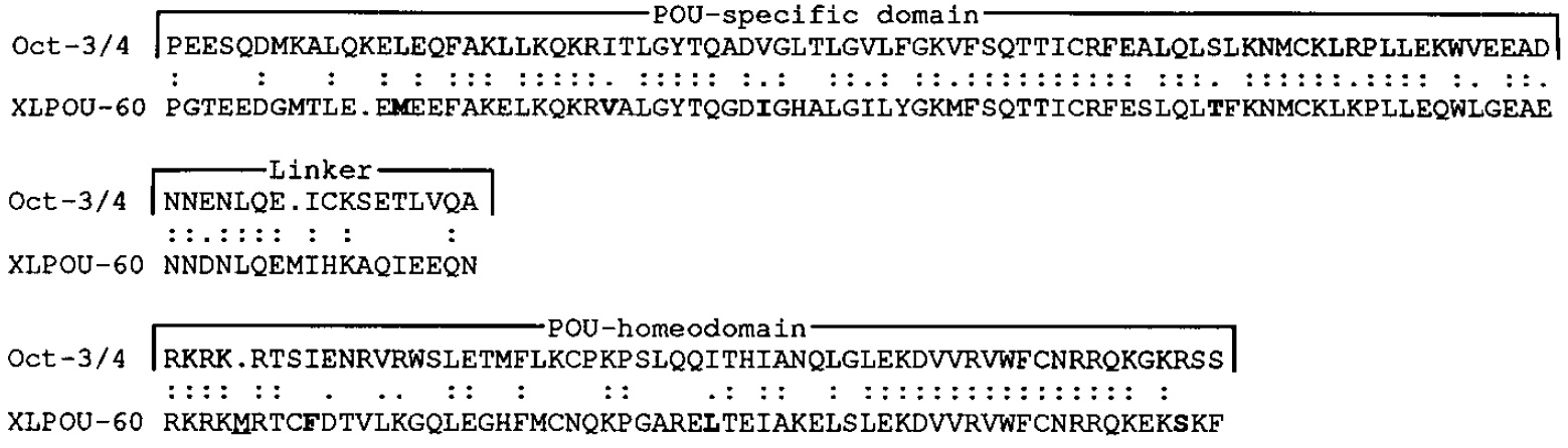 FIG. 2. A comparison of the amino acid sequences of the POU domains of XLPOU-60 and Oct-3/4. Identical residues are indicated with two