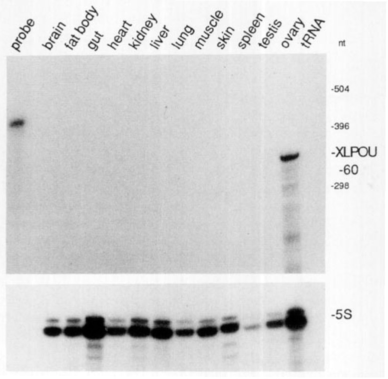 of the XLPOU-60 transcript in the stage VI oocyte. Lanes are as labelled.