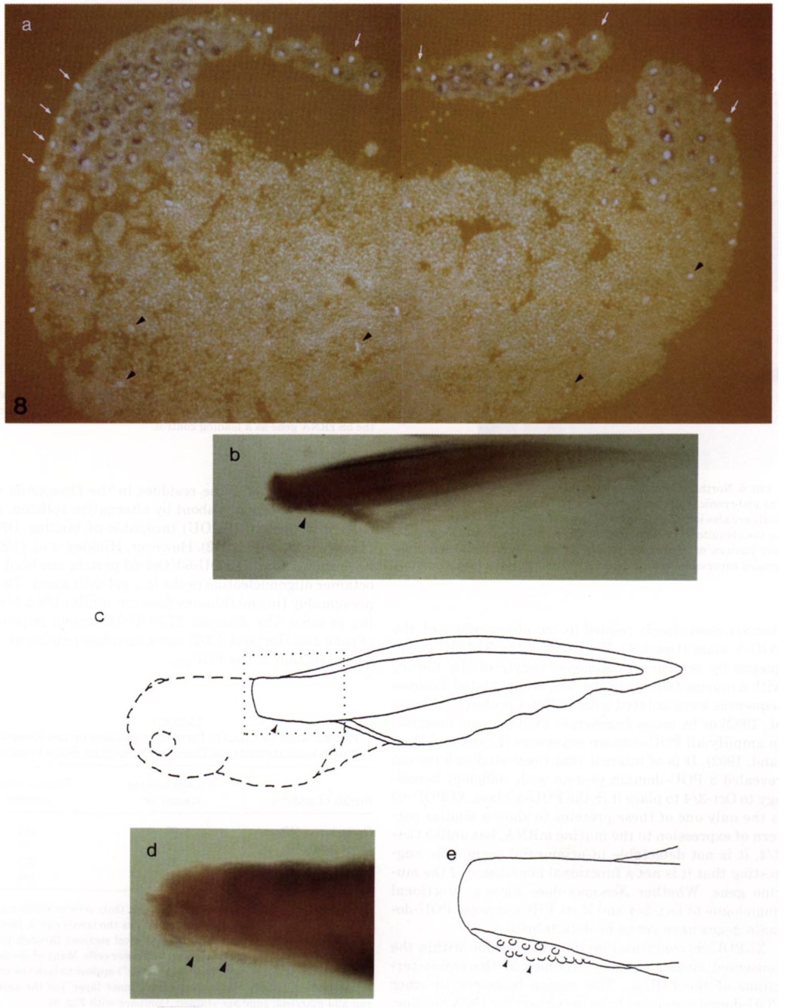 dorsal body wall, where the primordial germ cells are located at this stage (arrowhead). Some blue stain is seen in the tailfin, but this is