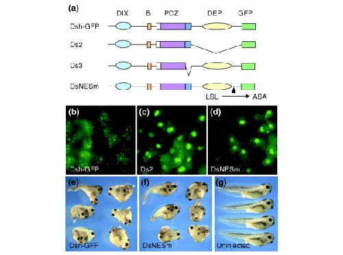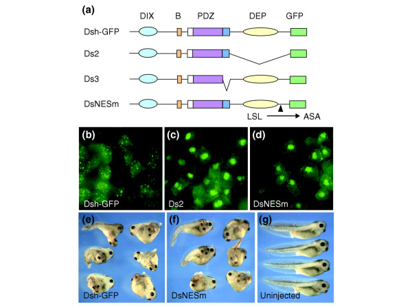 Figure 1. Nuclear export of Dsh is not critical for its activity. (a) The Dsh constructs used to analyze nuclear export. (b-d) RNAs encoding Dsh-GFP, Ds2 and DsNESm (0.5 ng each) were injected into two animal blastomeres of 4–8-cell embryos. Animal-cap explants were excised at stage 10, fixed and examined for GFP fluorescence. (b) Wild type Dsh-GFP localized in punctate structures of the cytoplasm, whereas (c) Ds2 and (d) DsNESm accumulated in the nucleus of animal pole cells. (e,f) One ventral vegetal blastomere of 8-cell embryos was injected with 1 ng Dsh-GFP or DsNESm RNA as indicated. Complete secondary axes were induced in both cases. (g) Uninjected sibling embryos.