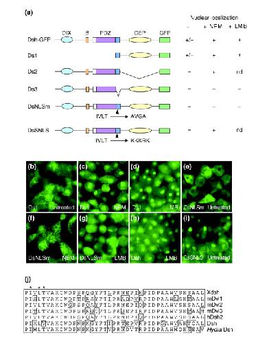 Figure 4. Mapping nuclear localization signals in Dsh. (a) The Dsh constructs used to study nuclear transport and their localization to the nucleus after NEM or LMB treatment; the DIX, PDZ and DEP domains are shown as in Figure 1a; B is the basic region and nd denotes not done. (b-i) Subcellular localization of Dsh-GFP constructs in the absence or presence of NEM or LMB. Embryos were injected with 0.5 ng of each mRNA, and GFP analysis was carried out as in Figure 1b-d. (b-d) Ds1, (e-g) DsNLSm, (h) Dsh, (i) DsSNLS. (b,e,i) no NEM treatment; (c,f) after NEM treatment; (d,g,h) after LMB treatment. (j) Comparison of conserved amino-acid sequences that are required for Dsh nuclear localization; X denotes the Xenopus protein, m the mouse and h the human. Amino-acid residues mutated in DsNLSm are indicated by asterisks.