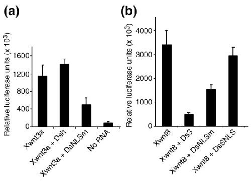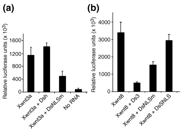 Figure 6. Dominant inhibition of Wnt-dependent transcription by Dsh mutants. Eight-cell embryos were injected (a) in one animal ventral blastomere or (b) in one vegetal ventral blastomere with -833pSia-Luc DNA (20 pg), mRNAs encoding Xwnt3a (5 pg) or Xwnt8 (2 pg), and Dsh-GFP, DsNLSm, Ds3 or DsSNLS mRNA (0.5 ng) as indicated. Luciferase activity was measured as described in Figure 5b.