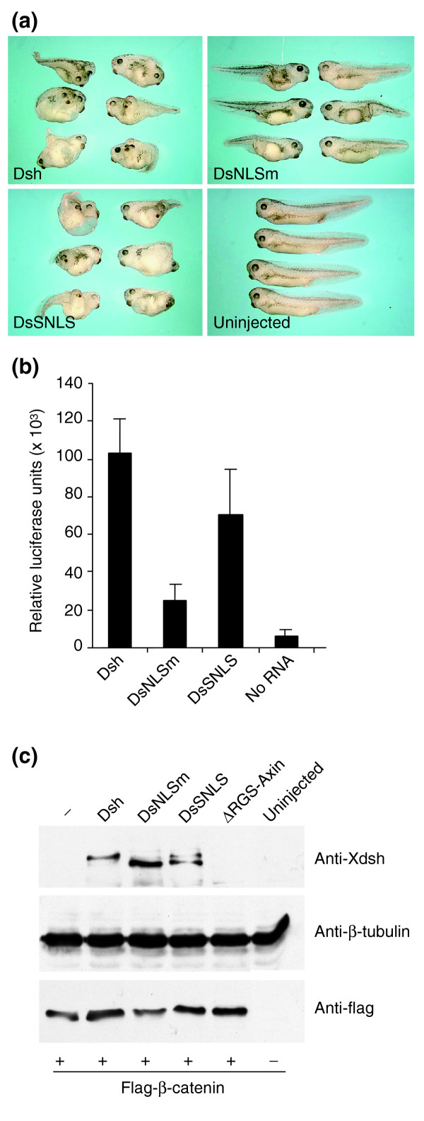 Figure 5. Activation of the Wnt/β-catenin pathway requires nuclear localization of Dsh. (a) Axis-inducing activity of Dsh constructs. One ventralvegetal blastomere of 8-cell embryos was injected with 1 ng Dsh-GFP, DsNLSm, or DsSNLS mRNA as indicated. Uninjected sibling embryos are also shown. (b) Activation of the Siamois reporter gene. The reporter -833pSia-Luc plasmid (20 pg) was coinjected with Dsh-GFP, DsNLSm or DsSNLS mRNA (0.5 ng each) into a single animal ventralblastomere of 8-cell embryos. Injected embryos were lysed at stage 10+ for luciferase activity determination. Results are shown in relative light units as the mean +/- standard deviation from triplicate samples. (c) Requirement for Dsh NLS for the stabilization of β-catenin. Flag-β-catenin mRNA (0.4 ng) was coinjected with Dsh, DsNLSm, DsSNLS or ÎRGS-Axin mRNA (2 ng each) into four animal blastomeres of 4â8-cell embryos. Levels of β-catenin and Dsh constructs were assessed in stage 10embryo lysates with anti-Flag antibodies and anti-Xdsh antibodies; β-tubulin serves as a loading control. Dsh and DsSNLS, but not DsNLSm, are able to stabilize β-catenin. ÎRGS-Axin was used as a control for an activator of the Wnt pathway.