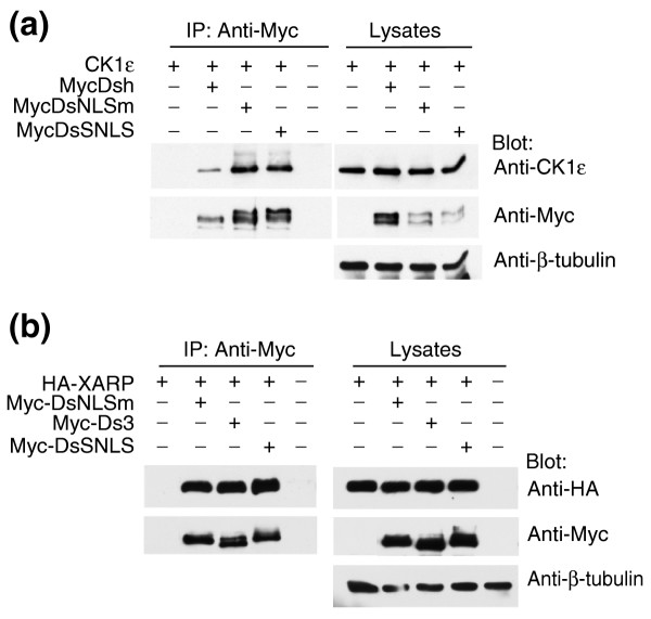 Figure 7. Dsh mutants retain the ability to bind CK1ε and XARP. Four-cell embryos were injected in four sites in the animal hemisphere with CK1ε, HA-XARP, Myc-tagged Dsh, DsNLSm, Ds3 or DsSNLS RNA alone (2 ng each) or in combinations as indicated. The embryonic lysates were collected at stage 10.5 for immunoprecipitation with anti-Myc antibodies. Co-immunoprecipitated (a) CK1ε or (b) HA-XARP was probed with anti-CK1ε or anti-HA antibodies; β-tubulin served as a loading control.