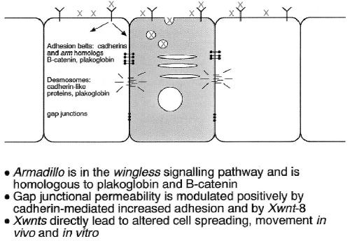 Wnt genes encode secreted glycoproteins, and, because of their homology with the Drosophila segment polarity gene wingless, are likely to play important roles as modulators of local intercellular signalling during embryonic development. Although little is known of the mechanisms by which Wnts signal in an autocrine or paracrine manner, it is increasingly clear that cells can respond rapidly to Wnt signals in the absence of transcription, and that these responses may include changes in cell adhesion and cell movement. We review recent evidence from studies on Xenopus laevis and other systems, which demonstrate that (1) a subset of Wnts modulate gap junctional permeability, which may be a reflection of changes in cadherin-mediated cell adhesion, (2) embryos express beta-catenin and plakoglobin, which are homologs of the armadillo gene products, known to be involved in the wingless signalling pathway, and known to be found at cell junctions, and (3) overexpression of specific Wnts in Xenopus embryos leads to clear changes in cell behavior and movement.