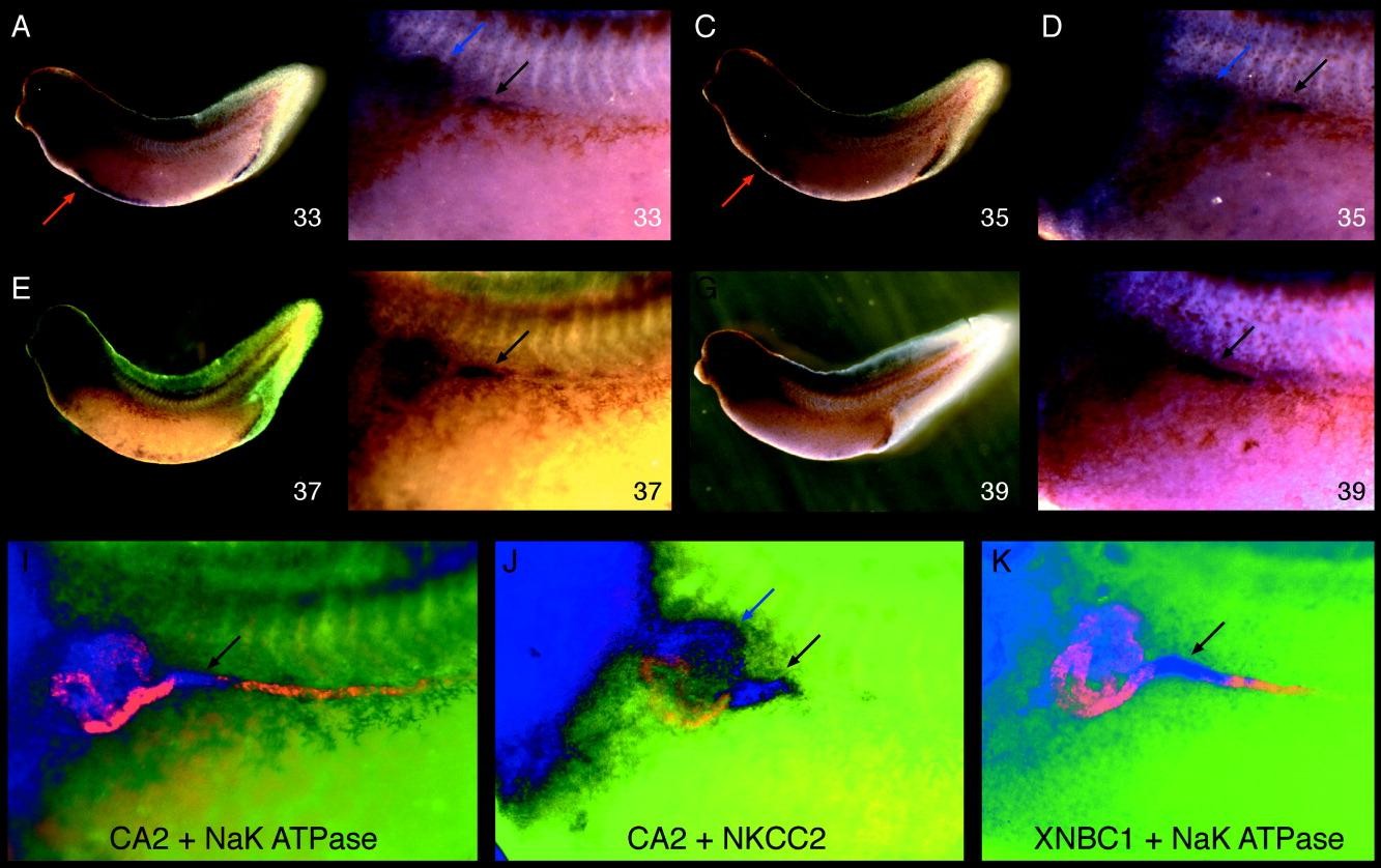 The kidney plays a critical role in regulating the composition of the blood, including pH. The major buffer regulating pH of the blood is bicarbonate. Bicarbonate is freely filtered through the glomerulus and must be recovered from the primary filtrate to maintain appropriate buffering capacity and blood pH. In this report, the expression of carbonic anhydrase type 2 within the late distal segment of pronephroi is described. This expression precisely overlaps that of the sodium-bicarbonate transporter XNBC1. In mammalian kidneys, these two proteins collaborate in the transepithelial recovery of bicarbonate from the kidney filtrate. Coexpression of the genes encoding these proteins in Xenopus embryos indicates that pronephroi use the same recovery system and that this system is largely localized to the late portion of the pronephric distal segment. Not only do the simple pronephroi regulate water and solute balance, they also appear to regulate blood pH in a manner akin to that of the vastly more complex mammalian metanephric kidneys.