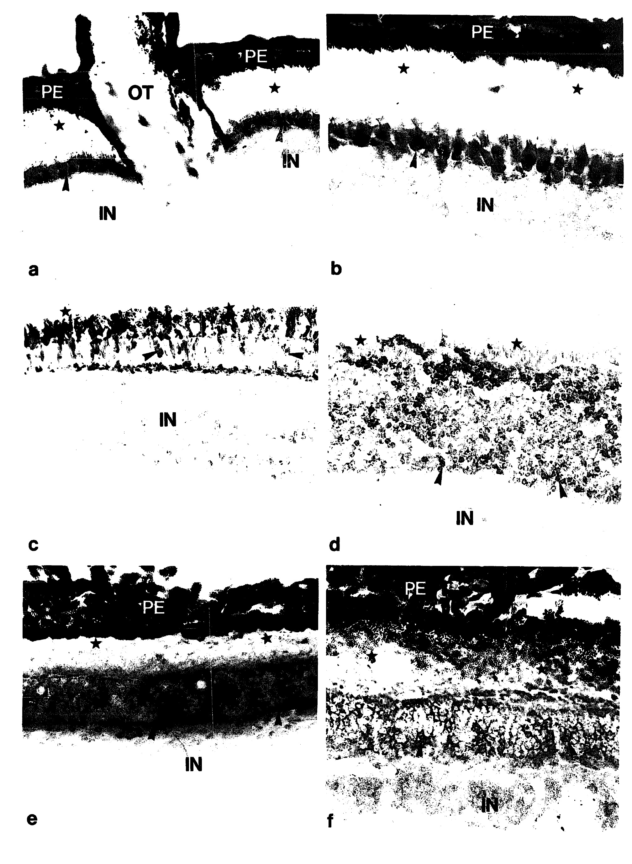 pigment; *, outer segments; arrowheads, outer nuclear layer; IN, inner nuclear layer, OT, optic tract. Note that the recoverin immunoreaction is