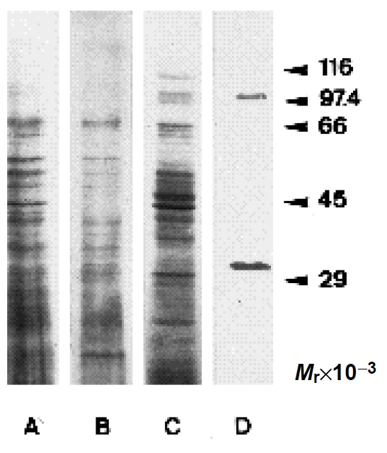 column (lane A), preparation of Xenopus (lane B), chicken (lane