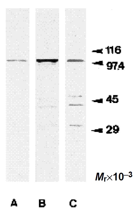 A protein of Mr 95,000 was detected in late embryos (stage 30). It
