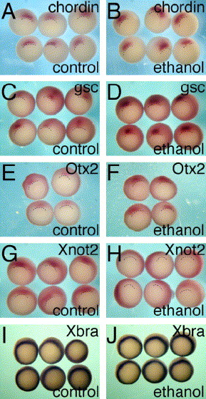 Fig. 2. Spemann's organizer is an early target of EtOH. Organizer-specific gene expression was studied in EtOH-treated embryos. Control (A, C, E, G, I) and EtOH-treated (B, D, F, H, J) embryos were analyzed for organizer specific gene expression at st. 10.5. The expression of chordin (A, B), gsc (C, D), Otx2 (E, F), Xnot2 (G, H) and Xbra (I, J) in EtOH-treated embryos is shown. |