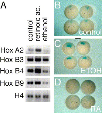 Fig. 4. Opposite effects of EtOH and RA on Hox and gsc expression. (A) Hox gene expression was studied at stage 13 by RT-PCR in embryos treated with EtOH (2.5%) or RA (1 μM). (BâD) In situ hybridization with the gsc-specific probe was used to corroborate the opposed effects of EtOH and RA. Changes in the expression pattern of gsc (st. 11) were determined in the control (B), EtOH-(C) and RA-treated (D) embryos. |
