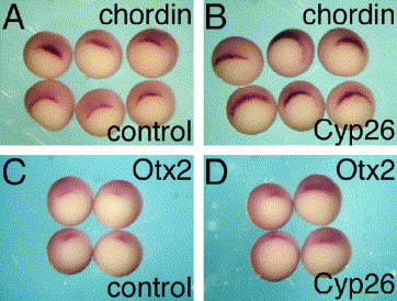 Fig. 7. RA metabolism by Cyp26 overexpression results in changes in organizer-specific gene expression. Active RA levels were reduced by Cyp26 mRNA injection. At st. 10.5, the embryos were processed for in situ hybridization with chordin (A, B) and Otx2 (C, D) specific probes. Control untreated sibling embryos are marked. |