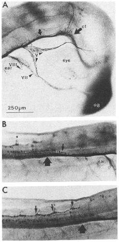 placode. B, Horizontal section through the rhombencephalon of the embryo in A; anterior is up. Arrowheads at VII, VIZZ, and IX point to anti-