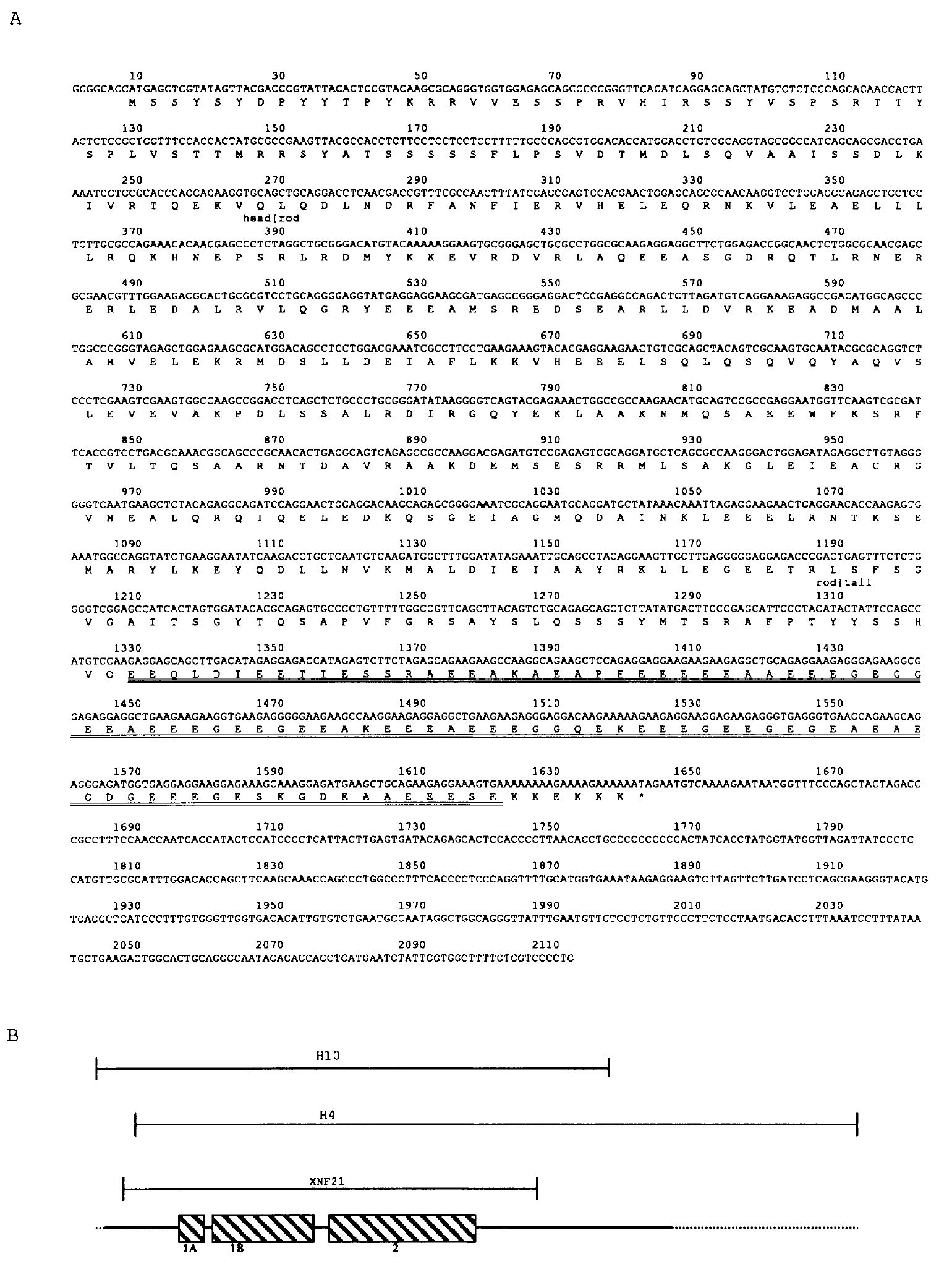 Figure 2. A, Assembled partial cDNA sequence and deduced amino acid sequence of XNF-L. The junctions between head, rod, and tail domains