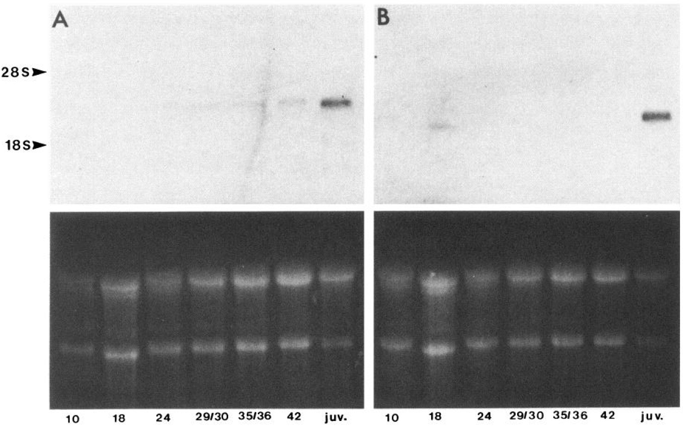 from indicateds tageso r juvenile brain weres eparatedan d transferredto nitrocellulosea sd escribedB. lotsw ere then hybridized with identical
