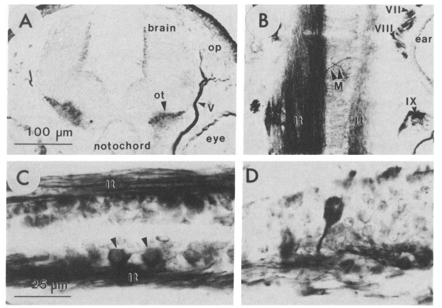 the Mauthner neurons at the point of decussation (arrowheads at M). C, Horizontal section (anterior is to the right) showing anti-XNIF-immunoreactive