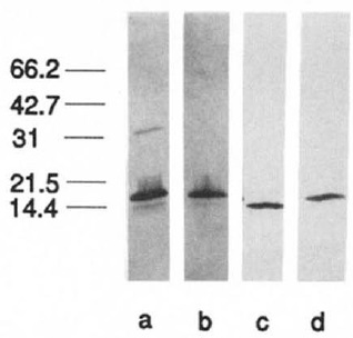 A 14-kDa contaminant flowed through DEAE-Sepbarose (lane c),