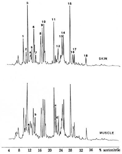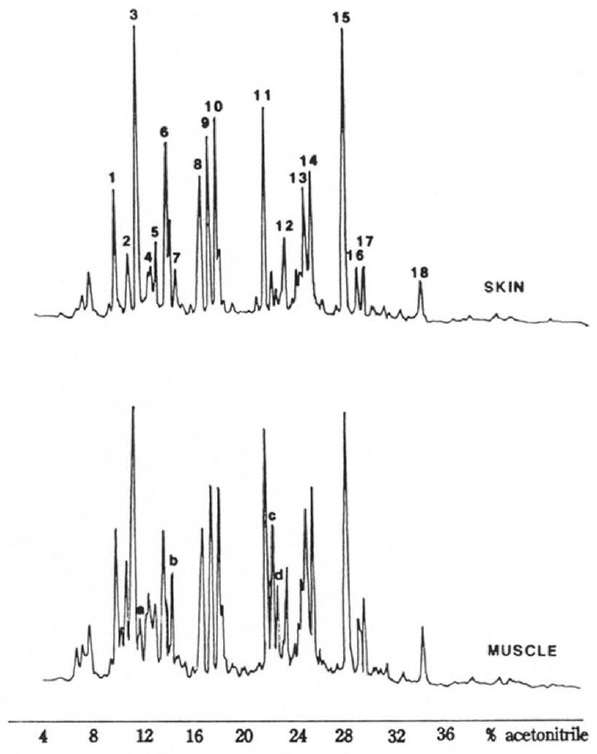 FIG. 2. HPLC profiles of tryptic digests of skin and muscle