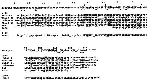 FIG. 7. Amino acid sequence comparison of the X. laevis 16-kDa lectin with other vertebrate S-Lac lectins. The amino acid