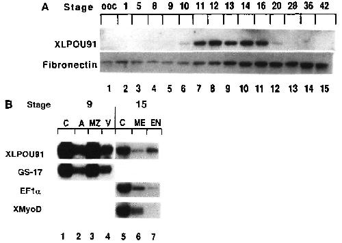stage 7, and in 1/3XMR from stages 7-11. Filters were sequentially hybridized with the cDNA probes for XLPOU91,