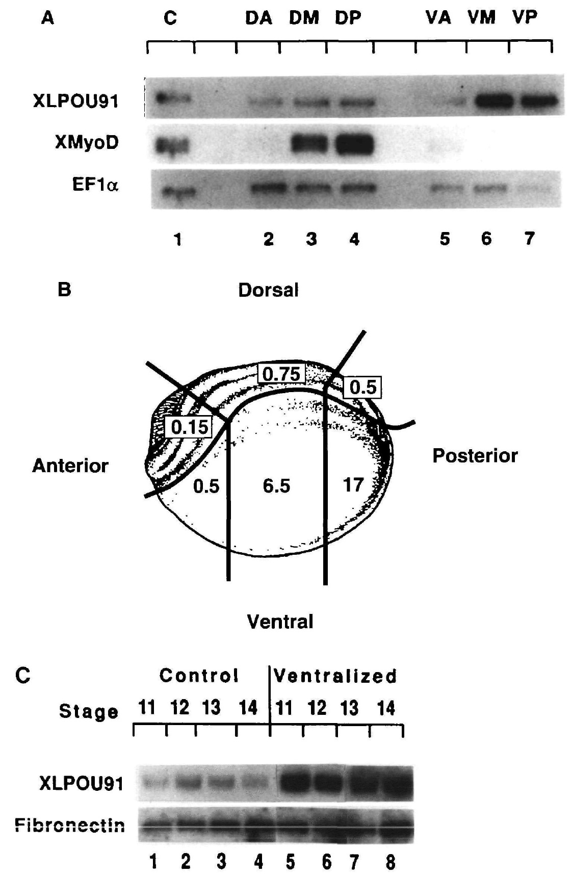 Fig. 2. (A) Expression of XLPOU91 mRNA during