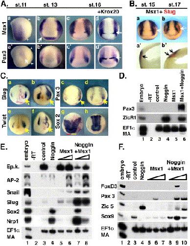 Figure 1. Msx1, Pax3, and Slug Expression in the Presumptive Neural Crest Domain and Msx1 Neural Crest-Inducing Activity In Vivo and in Explants(A) Msx1 (aâd) and Pax3 (aâ²âdâ²) expression in X. laevis at stages 11 (a and aâ²), 13 (b and bâ²), and 16 (câdâ²) costained with Krox20 (dâdâ², indicates third rhombomere). Arrows in aâaâ² indicate the blastopore lips at stage 11. aâaâ², lateral views; bâdâ², dorsal views.(B) Coexpression of Msx1 and Slug by double ISH (Msx1 [blue]; Slug [red]; a; b, dorsal views; aâ²âbâ², transverse sections).(C) Msx1 mRNA was injected in one blastomere at the four cell stage, LacZ is revealed in pink (yellow arrow points at injected side). The embryos were analyzed at early (stage 13, a, c, e, and g) or late (stage 16, b, d, f, and h) neurula stages by ISH for Slug (a and b), Pax3 (c and d), Twist (e and f), and Sox2 (g and h) (red bar, uninjected neural plate half; yellow bar, width of the neural plate on the injected side). Dorsal views.(DâF) RT-PCR analysis of neural, ectoderm and early NC markers: Pax3 and ZicR1 (D); AP-2, Snail, and Slug (E); FoxD3, Pax3, Zic5, and Sox9 (F) after coinjection of Msx1 and Noggin. (D) Lane 4, Noggin (25 pg); lane 5, Msx1 (500 pg); lane 6, Msx1 (500 pg) + Noggin (25pg). (E) Lane 4, Noggin (25 pg); lane 5, Msx1 (100 pg); lane 6, Msx1 (500 pg); lane 7, Msx1 (100 pg) + Noggin (25 pg); lane 8, Msx1 (500 pg) + Noggin (25 pg). (F) Lanes 1â4, as in (E). Lanes 5â7, Msx1 (100â250â500 pg). Lanes 8â10, Noggin (25 pg) + Msx1 mRNA (100â250â500 pg). |